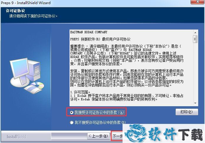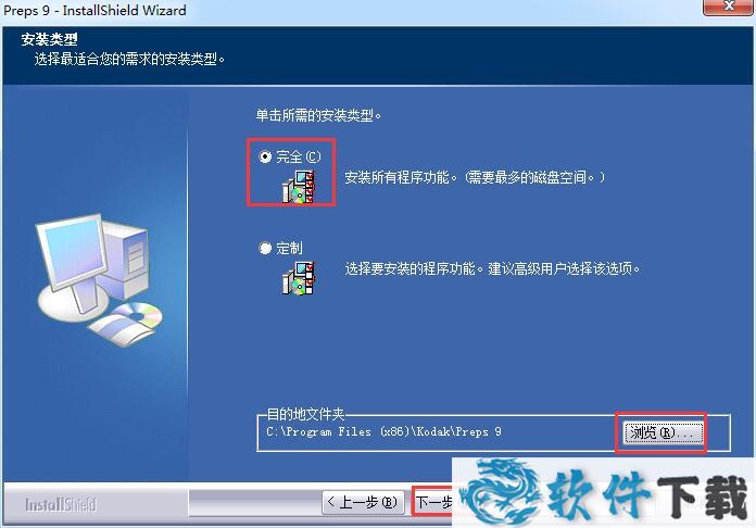 5.选择安装类型和安装目的地文件夹,默认的是【C:\Program Files (x86)\Kodak\Preps 9】,单击【浏览】自定义