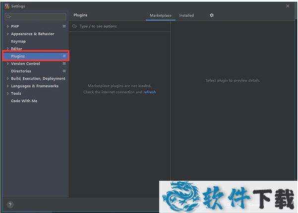 8.运行PhpStorm2021,界面是英文版本,使用快捷键【Ctrl+ALT+S】打开【Settings -> Plugins】进行设置