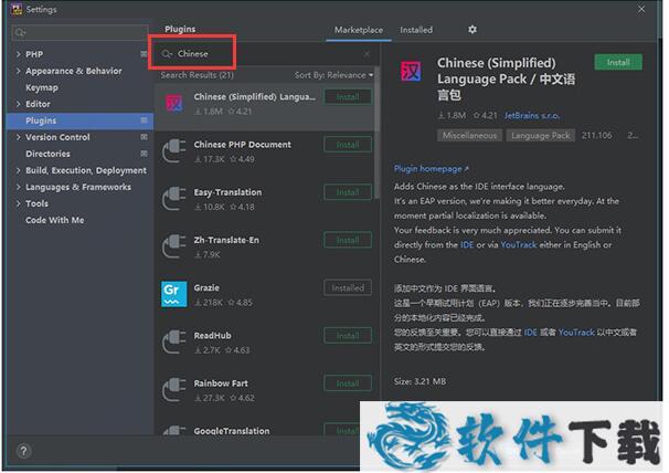 9.在搜索框内输入【Chinese】,找到中文语言包点击Install安装