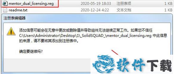 12.运行“ mentor_dual_licensing.reg”并确认将信息添加到Windows注册表中,点击是