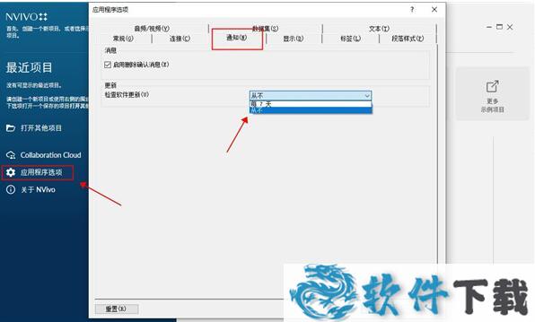7.关闭互联网启动软件,依次选择“应用程序选项”-“通知”,在“检查软件更新”中选择“从不”