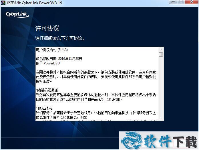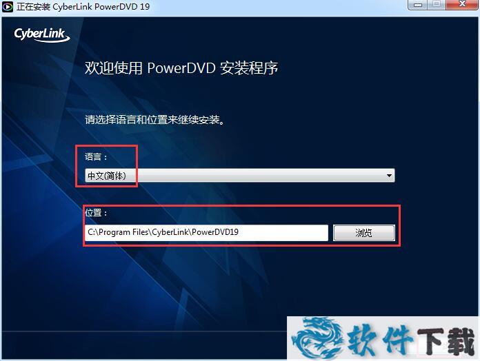 5.接下来开始安装主程序,双击PowerDVD_19.0.1511.62_Ultra.exe文件,进入安装界面,选择安装语言【中文简体】,选择安装位置,默认的是【C:\Program Files\CyberLink\PowerDVD19】,单击【浏览】修改,单击【下一步】