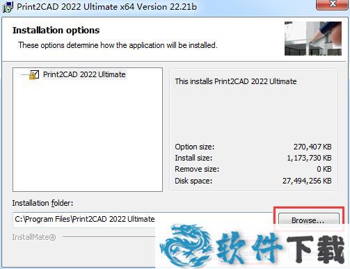 6.选择安装文件夹,默认的是【C:\Program Files\Print2CAD 2022 Ultimate】,单击【browse】修改,然后单击【install】开始安装