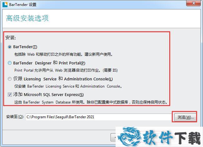 4.选择安装的组件,选择安装位置,默认的为【C:\Program Files\Seagull\BarTender 2021】,单击【浏览】自定义,单击【安装】开始安装进程