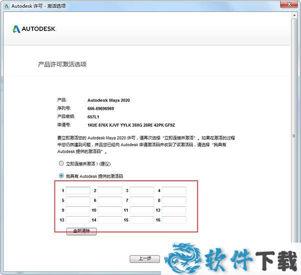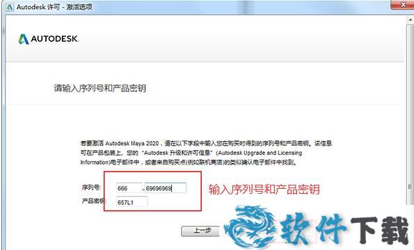 9.输入maya2020.4产品序列号【666-69696969、667-98989898、 400-45454545、066-66666666】任意一组,产品密钥【657L1】;