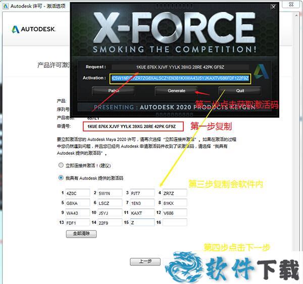 14.再将申请号【1KUE 876X XJVF YYLK 39XG 28RE 42PK GF9Z】复制到注册机request中,再点击generate得到激活码【4Z0C5W1NPJT7ZR7ZG8XALSCZ1EN381KXWA43J5YJKAXTV686FDF122F9Z】,最后将激活码复制到软件注册框中,最后点下一步;