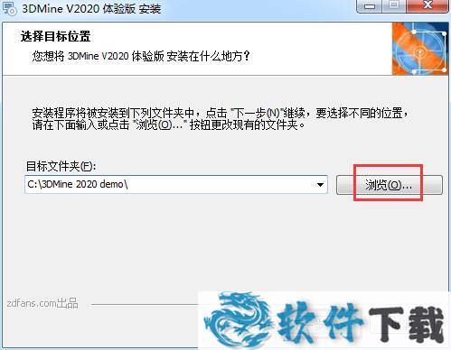 4.选择软件的安装位置,默认的是【C:\3DMine 2020 demo\】,单击【浏览】修改