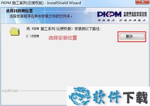 4.选择PKPM2018的安装目的地,默认是【C:\PKPM】,选择其他文件夹单击【更改】