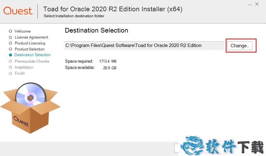 6.选择软件的安装位置,默认的是【C:\Program Files\Quest Software\Toad for Oracle 2020 R2 Edition】,单击【change】修改,单击【next】