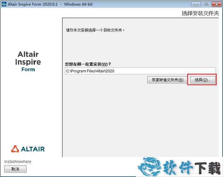 6.选择Inspire Form 2020安装文件夹,默认的为C盘,单击【选择】修改