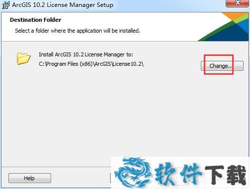 5.选择安装目的地,默认的为【C:\Program Files (x86)\ArcGIS\License10.2\】,单击【change】修改