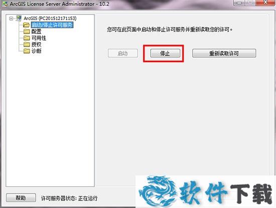 7.安装完毕后,打开开始菜单-ArcGIS-License Manager,运行“License Server Administrator”,选择停止服务。如图