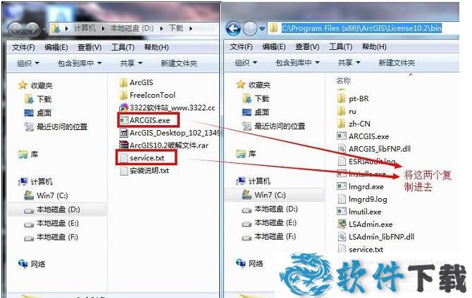 16.打开破解文件,将里面的“service.txt”和“ARCGIS.exe”复制到Lincense10.2的安装目录覆盖源文件