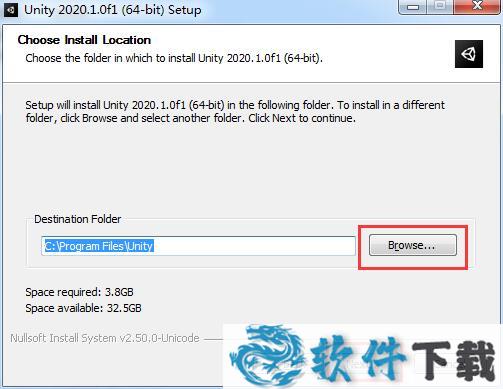 7.选择软件的安装位置,默认的是【C:\Program Files\Unity】,可以单击【browse】自定义,单击【next】开始安装