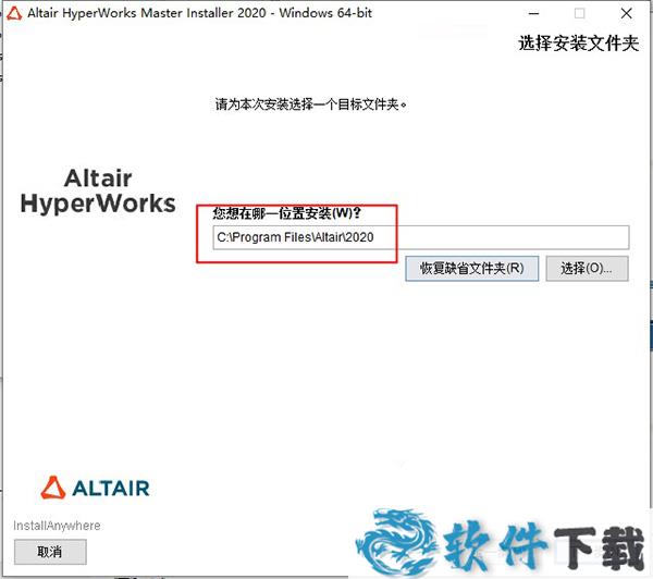 6.选择HyperWorks2020安装目标文件夹,默认的是C盘,可以单击【选择】按钮选择其他位置