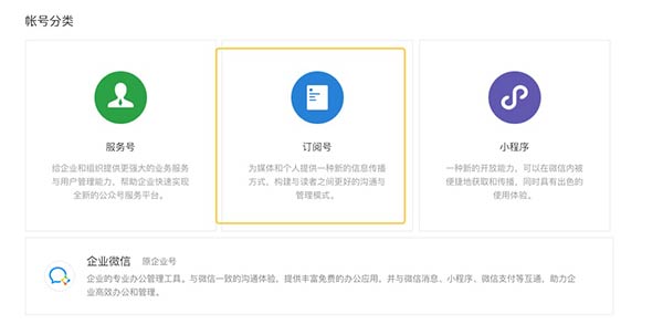 2.界面上需要我们先用个人的微信账号登陆,登陆完成后你就有资格注册订阅号、服务号、小程序和企业微信了,这次我们只要选择订阅号即可,如图: