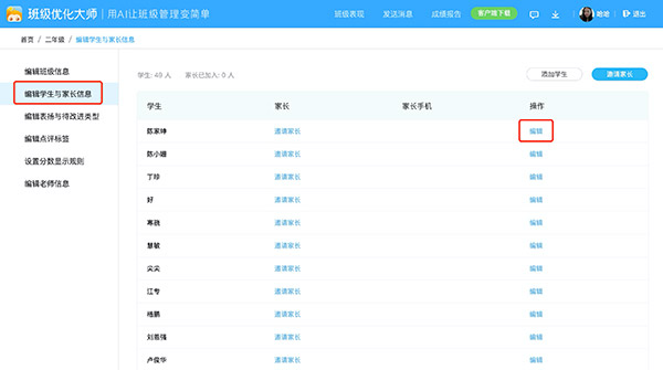 3.在【编辑学生与家长信息】中点击对应学生的【编辑】: