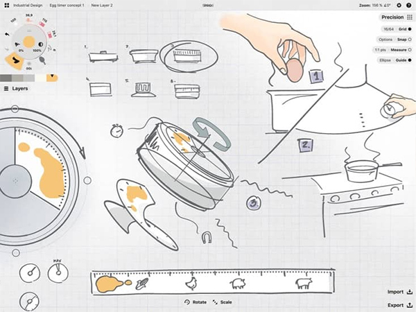 快速迭代或探索愉快的偶然——是概念画板的灵活核心。长按选择你所画的任何笔画,然后进行复制、测量、更改工具、线宽、颜色,或者删除。这是具有矢量特性的传统工具之美。
