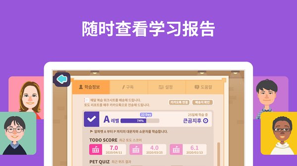 创建存档时水平选择错误?没关系!在家长界面可以随时更改水平设定,编辑存档和查看学习进度。同时每阶段提供学习程度评测(Pet Quiz),通过家长页面能即时查看孩子完成的学习内容以及掌握程度。