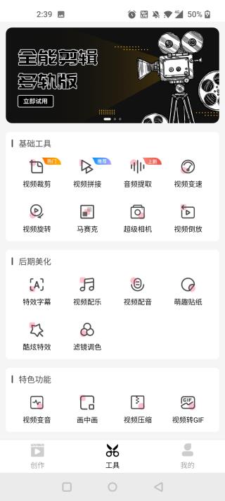 支持选择本地视频剪辑、拼接、滤镜、配乐、字幕、主题mv、快慢放、旋转、提取音频、剪裁、倒放等各种便利视频工具,多种参数调节,轻松实现视频效果。