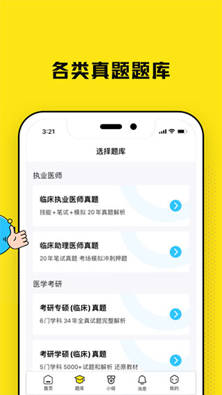 2.提供有很多学习的模式专区,包括了医考题库、考研题库、答题闯关、疾病查询等
