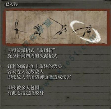 一边旋转身体一边斩向四周的流派技,趁着回转的势头而斩出攻击,可以将复数的敌人卷入,即使敌人防御依然可以造成伤害,被多个敌人包围时,有这个忍技即可从中脱身。