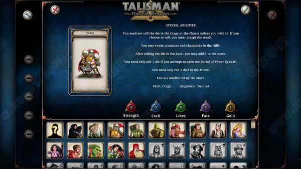 英雄:英雄属性包括力量值(Strength)、智慧值(Craft)、命运值(Fate)、金币值(Gold)、生命值(Lives)这五项,不同英雄属性值不同。力量值决定了和物理型敌人战斗时的攻击力,智慧值决定了和魔法型敌人战斗的攻击力。命运值在你摇骰后可获得一次重掷机会,会消耗可从奖励中补充。金币嘛,就是买装备和找人疗伤用的。除基本属性外,每个英雄也都有专属的特殊能力。