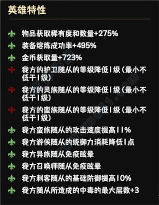 这是我选取的英雄的能力,正向收益主要看有没有游侠随从统御力消耗降低1点和灵族随从统御力消耗降低1点这两个词条,负面收益主要看有没有所有随从统御力消耗增加1点和默认拾取水晶降低这两个词条,有一个正向收益并且英雄初始统御力不小于12就可以了,随从等级增加或者降低这个词条不用管,它不会影响随从的星级。