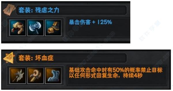 其中羊头(异界制裁者)既可以提供暴击和物穿,又可以阻止治疗,实在是很好用,大斧头(银月新星)提供暴击,爆伤,削甲,增伤神器,噬魂长戟有最大生命值伤害,打血牛必备,其他的输出装都没有这三个优秀,值得一提的是这两个套装: