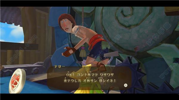 2、然后从木桶男旁边的门出去,会被2楼的NPC叫住,然后利用左手柄的Z锁定,然后按A和其远距离对话接受一个小任务——爬上2楼。注意看,门口那个石碑一样,上面还有个鸟雕像的就是记录点。此外地面上的记录点会增加返回天空的选项,是在地面时候唯一返回天空的方式,迷宫中的记录点则多了迷宫脱出的选项。
