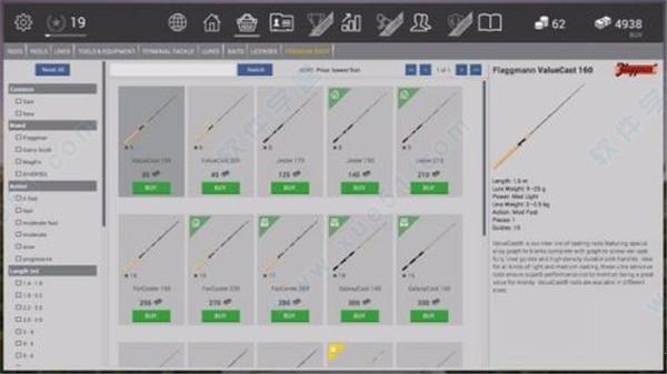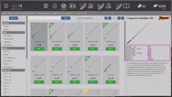 简单而言,竿子越长越软,假饵越重,就抛的越远,商店里的竿子名字后面的数字表示的就是长度,而负荷越大的竿子就越适合钓大鱼,但同时需要的饵重就越大,过轻的饵无法抛远。想要远投,线Line也是很重要的一个部分,后续会有介绍。另外,目前游戏里还没有中硬(MH)的竿子,其它的都有。