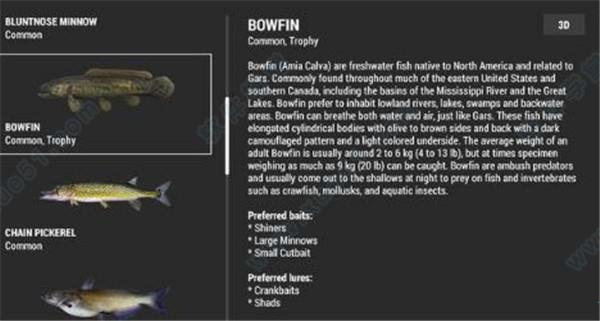 1、弓鳍鱼的牙齿粗壮而锐利,是贪婪的捕食者,肉食性,主要以水中生物和蛙类为食,长到10厘米左右开始捕食鱼类,也吃昆虫卵和浮游生物,成年个体还捕食蟹、虾等。一般的成年个体都在2到6公斤,最大被抓到的记录有9公斤之大。在游戏里的鱼饵可以用,Shiners 鳊鱼,Large Minnows 大号的小鱼, Small Cutbait 小鱼块,假饵可以用Crankbaits 曲柄饵,Shads 软虫,来捕获。
