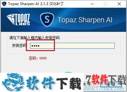 7、打开双击运行"Topaz Sharpen AI 2.1.3 汉化补丁.exe",在输入框中输入安装密码:0000