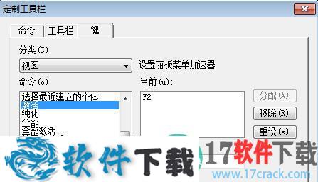 6、然后我们任意选择下拉选项中的选项,左边的为命令,右边的为快捷键。假如我们选中”视图“,下拉滑动条至”激活“命令,我们会发现”激活“命令的快捷键为F2