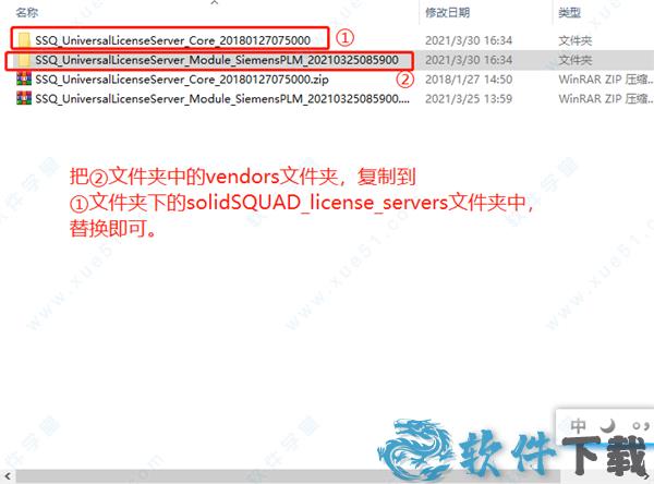 3、将解压出来的“SSQ_UniversalLicenseServer_Module_SiemensPLM_20210325085900”文件夹中的“Vendors”文件夹复制到“SSQ_UniversalLicenseServer_Core_20180127075000”文件加下的“SolidSQUAD_License_Servers”文件夹中。
