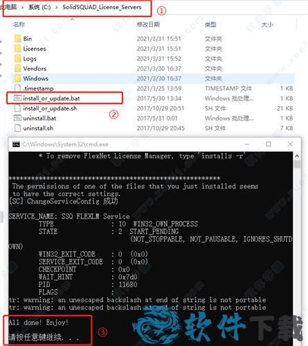 4、将SolidSQUAD_License_Servers复制到C盘根目录中①。用管理员身份运行install_or_update.bat②。出现下图如图所示之后③,按任意键退出。
