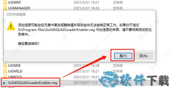 12、双击运行上一步复制过来的“SolidSQUADLoaderEnabler.reg”文件,选择“是”即可完成破解安装。在开始菜单栏中可以看到已经安装的NX软件。