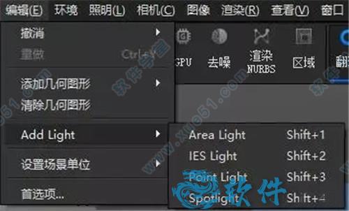 ● 现在可通过主菜单中的“编辑”->“添加灯光”来添加区域光,IES灯,点光和聚光灯