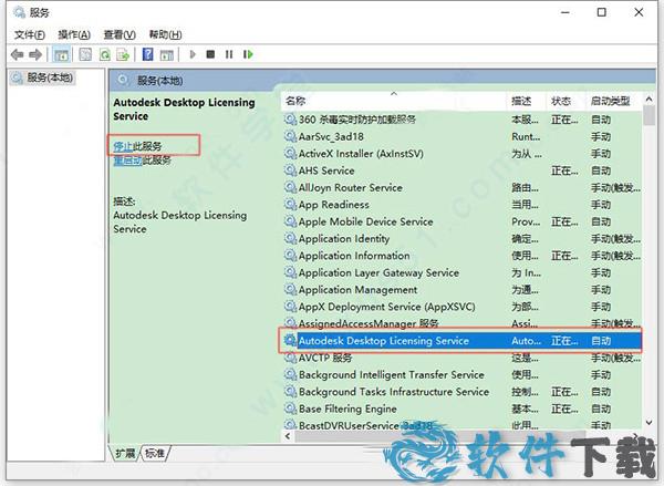 5、在服务管理器内找到Autodesk Desktop Licensing Service服务并且点击停止此服务。