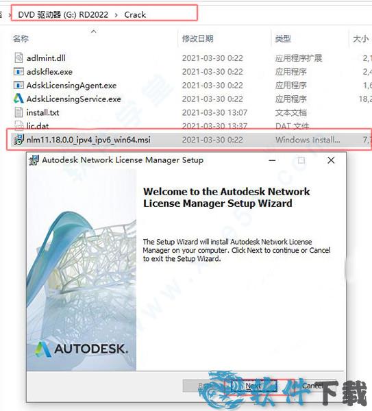 6、在我们的crack破解文件夹内找到nlm11.18.0.0_ipv4_ipv6_win64.msi运行然后安装Autodesk网络许可证管理器,其中默认安装是C:\Autodesk\Network License Manager。