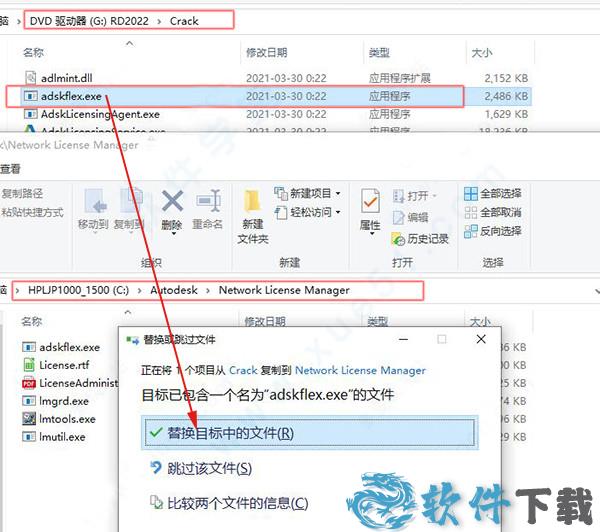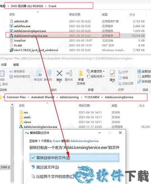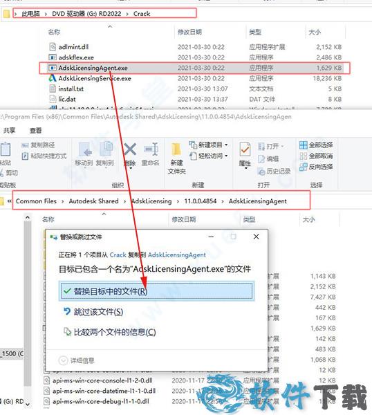 10、同上一步无异,将AdskLicensingAgent.exe复制到默认C:\Program Files (x86)\Common Files\Autodesk Shared\AdskLicensing\11.0.0.4854\AdskLicensingAgent\AdskLicensingAgent.exe,点击替换目标中的文件。