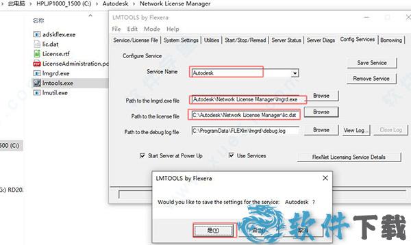 15、在config services中,添加“ Autodesk”服务名称,选择lmgrd.exe作为lmgrd的路径, lic.dat作为许可证文件的路径,然后勾选下面的start server at power up和use services。
