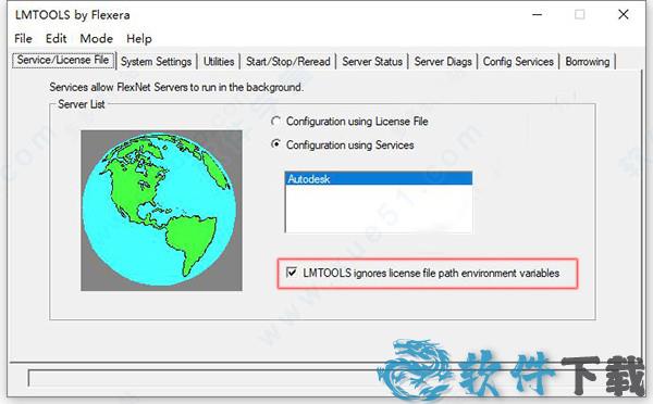 16、在“service/license file”中选择刚才的 Autodesk服务,然后勾选下面的ignore license file path env var。