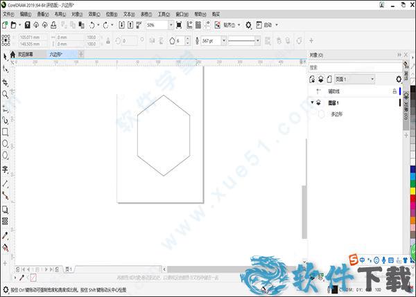 2、打开CDR矢量绘图软件后,直接用快捷键Ctrl+N新建文档。单击左侧的工具栏中的多边形工具,初始设定是五边形,单击上边工具栏增加边数即可画出六边形了,按住拖动出适合的大小即可。