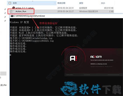 6、mirillis action安装成功后现不要打开软件,然后将网络断开,以管理员身份运行Action_Run.bat,自动加载!