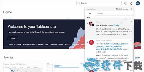在 Tableau Server 和软件 中经过全新改版的通知中心,可以管理您的所有通知。这个专门的空间在一个位置集中显示您的共享情况、评论、数据提取和准备流程,从而整合了您的整个组织中的所有重要更改。您可以通过首选项控制要通过什么方式接收这些通知,具体可选择直接在 软件显示通知和/或通过电子邮件接收通知,这有助于您避免错过重要通知,从而可及时采取行动。