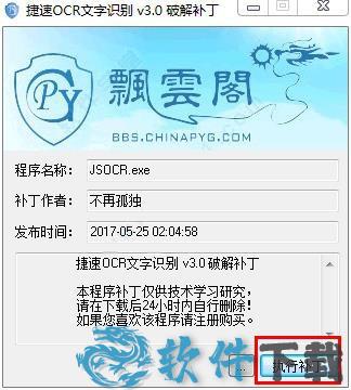 2、我们现在下载“捷速OCR文字识别 v3.0 破解补丁.exe”补丁,打开破解补丁后,点击“执行补丁”。