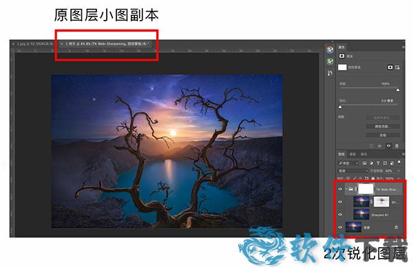 此时,插件自动复制生成一个原图片的小图副本,右边的图层组包含了2次锐化的所有图层,方便我们对锐化区域进行修改。比如对某些需要保持柔和的区域执行蒙版擦除的功能。