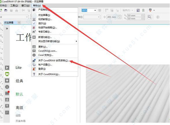 2、进入到软件页面,点击“帮助”选择“coreldraw”