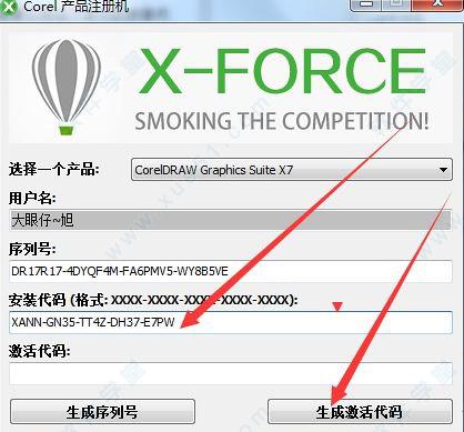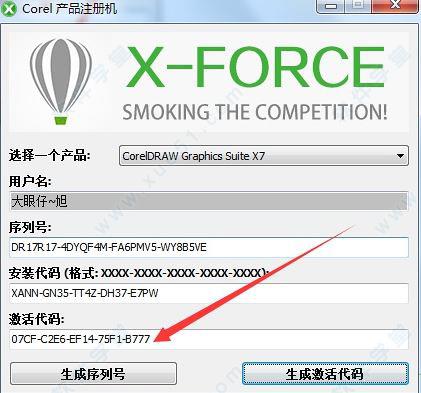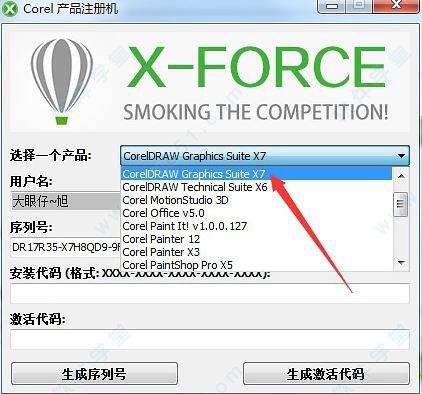 6、双击打开注册机,选择相应的coreldraw x7版本,然后点击生成序列号。